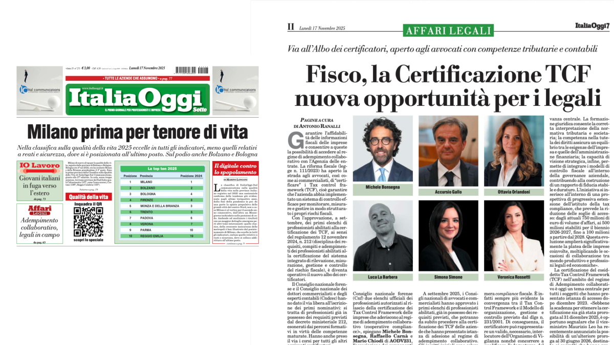 Siamo lieti di condividere l’articolo “Fisco, la certificazione TCF: nuova opportunità per i Legali” pubblicato su Italia Oggi il 17 novembre 2025, che illustra l’operatività del nuovo Albo dei certificatori del Tax Control Framework (TCF).