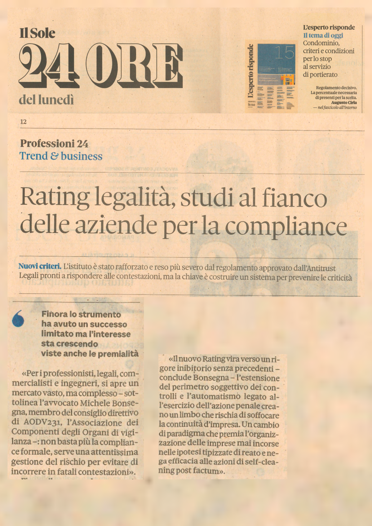 Di seguito il sunto dell’articolo pubblicato in data odierna sul Sole 24 Ore, all’interno del quale ho avuto il piacere di condividere alcune riflessioni in merito alle recenti evoluzioni del Rating di Legalità.